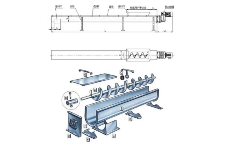 主要由減速機、聯(lián)軸器、減速機座、螺旋體、懸掛裝置、殼體等部分組成(總長度<4m的無懸掛裝置)。